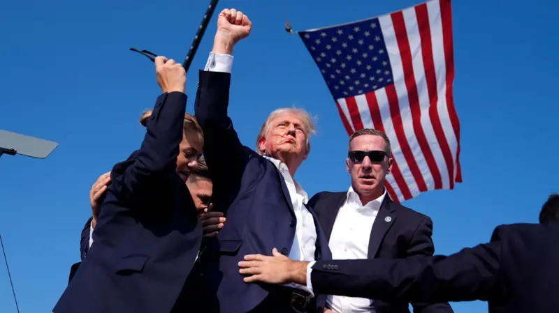 Кандидат в президенты от Республиканской партии упал на землю. Пуля чиркнула ему по уху. Покидая сцену, он поднял кулак в знак борьбы.