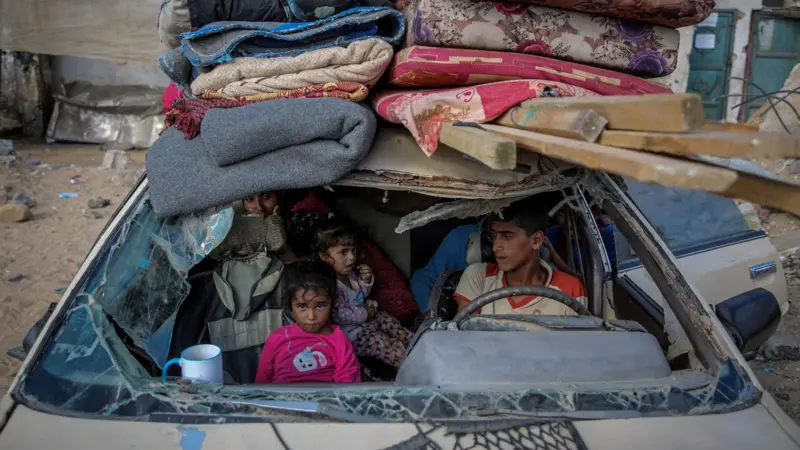 Палестинцы в секторе Газа едут на поврежденном автомобиле из восточной часть Хан-Юниса, получив от израильской армии распоряжение об эвакуации.