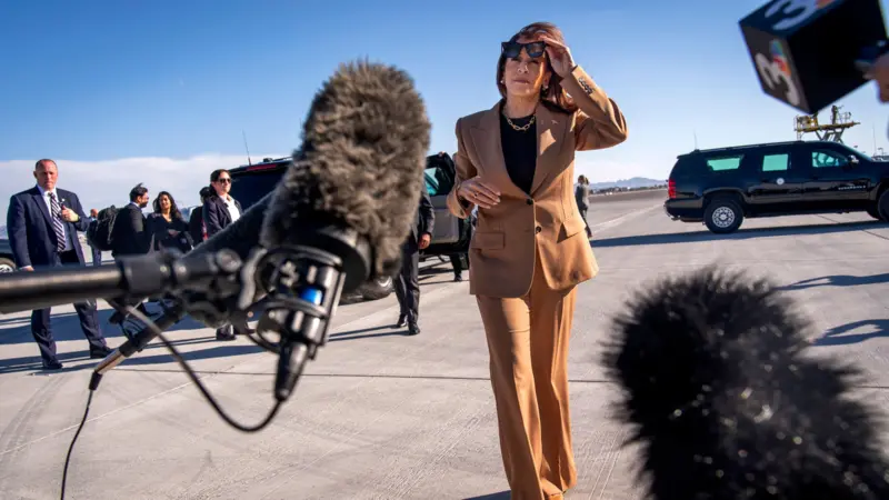Кандидат в президенты от Демократической партии Камала Харрис идет поговорить с журналистами перед посадкой в самолет Air Force Two в аэропорту Лас-Вегаса.