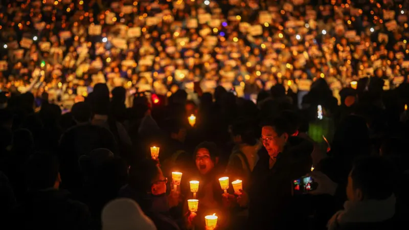 Люди собрались со свечами и плакатами на митинг за отставку президента Южной Кореи Юн Сук Ёля.