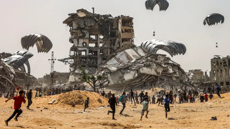 Люди бегут к коробкам с гуманитарной помощью, падающим над северной частью сектора Газа в апреле 2024 года.