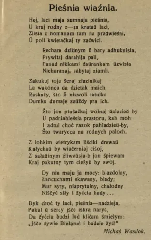 Дык усе разам грамадою шчырым сэрцам і душою: Беларусь вас заклікае, Сыноў маці зазывае, годзі век цярпець».