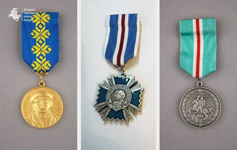 На фота АПК (злева направа): медаль Францыска Скарыны, Крыж Адраджэння Беларусі (братоў Луцкевічаў), медаль «За плённую працу на карысць Беларусі»
