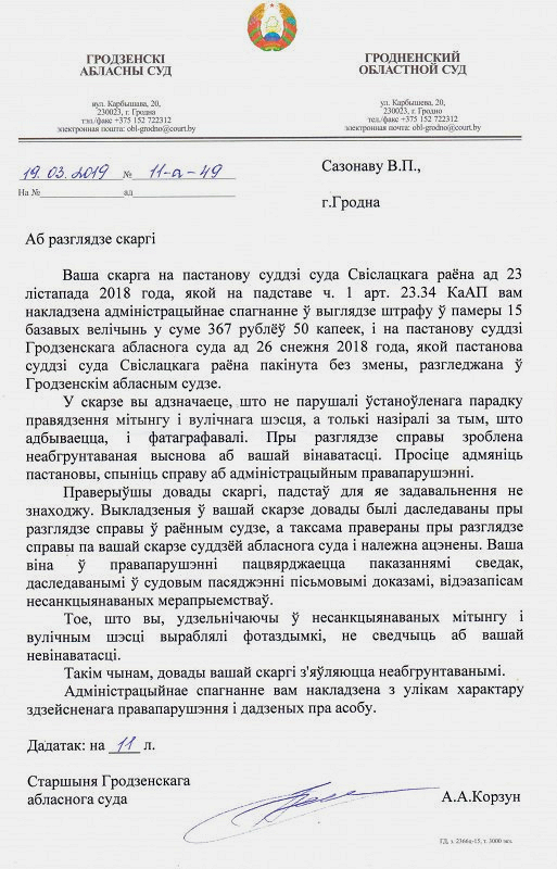 Як вынікае з адказу, датаванага 19 сакавіка 2019 года, старшыня Гродзенскага абласнога суда Аляксандр Корзун цалкам не задаволіў скаргу і пазначыў, што віна ў правапарушэнні нібыта пацверджаная паказаннямі сведак, “пісьмовымі доказамі і відэазапісам несанкцыянаванага мерапрыемства”.