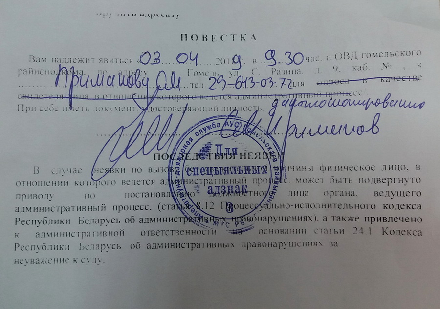 Журналістка-фрылансерка Ларыса Шчыракова атрымала позву за подпісам участковага інспектара Сяргея Прымакова  з АУС Гомельскага райвыканкама,  якой яе выклікаюць для прахаджэння дактыласкапіі. Пры чым, позва была проста пакладзена ў паштовую скрыню.