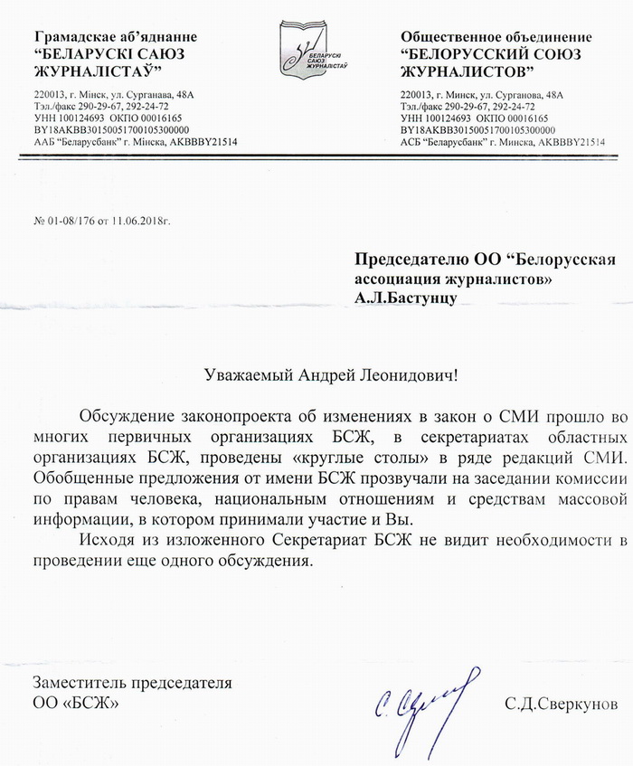 Сыходзячы з гэтага Сакратарыят БСЖ не бачыць неабходнасці ў правядзенні яшчэ аднаго абмеркавання”, — гаворыцца ў адказе намесніка старшыні Беларускага саюза журналістаў Сяргея Сверкунова.