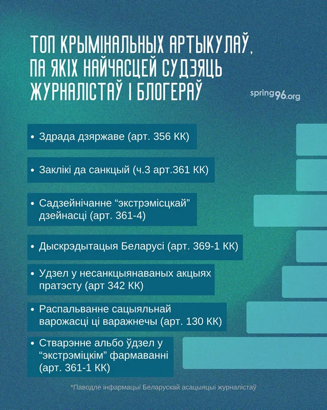 Самы распаўсюджаны крымінальны артыкул, па якім асуджалі, альбо прад’явілі абвінавачанне прадстаўнікам СМІ – “стварэнне альбо ўдзел у “экстрэміцкім” фармаванні” (ч. 1 альбо ч. 3 арт. 361–1 КК). Яго абвінавачанне выкарыстоўвала ў 21 выпадку.