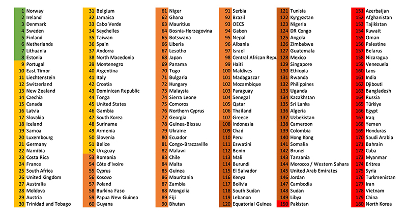 Беларусь знаходзіцца ў чырвонай зоне, займаючы 157‑е месца паміж Палестынай і Нікарагуа. Ніжэй нашай краіны — Турцыя, Куба, М’янма, Кітай, Расія і іншыя краіны. У параўнанні з мінулым годам РБ апусцілася на чатыры пазіцыі (у 2022‑м займала 153‑е месца).