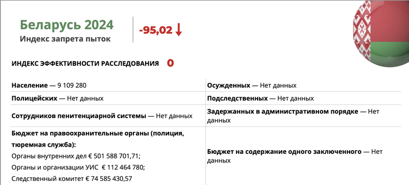 «Адмоўнымі лідарамі Індэкса забароны катаванняў, як і ў папярэднія гады, працягваюць заставацца Беларусь і Расія. У абедзвюх краінах за 2024 год не назіралася ніякая станоўчая дынаміка, паказчыкі Індэкса застаюцца вельмі нізкімі, па Беларусі выніковая лічба знізілася на 1,19 пункта, па Расіі — на 1,72 пункта», — кажуць эксперты.