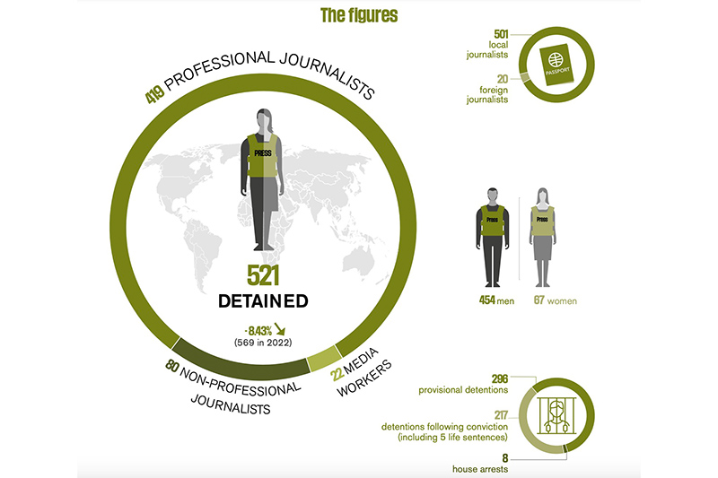521. Для параўнання: год таму лічба складала 569. Цяпер на «ліку» чатырох краін — Кітая, М’янмы, В’етнама і Беларусі — 264 зняволеныя рэпарцёры.