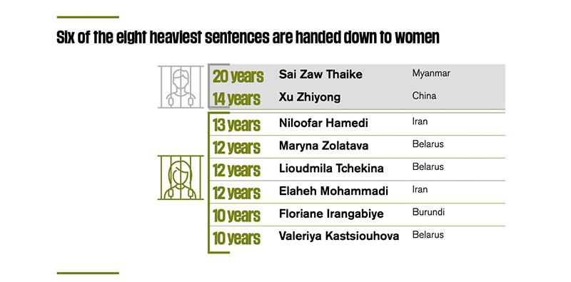 Апроч таго, Беларусь пазначаная ў справаздачы як краіна з найбольшай колькасцю (пасля Кітая) жанчын-журналістак у няволі — 10. У гэтым жа сумным паказчыку рэжым застаецца антылідэрам. Па дадзеных RSF, тры з шасці самых жорсткіх прысуды ў свеце жанчынам-журналісткам былі вынесеныя беларускам: Марыне Золатавай (12 гадоў), Людміле Чэкінай (12 гадоў) і Валерыі Касцюговай (10 гадоў).