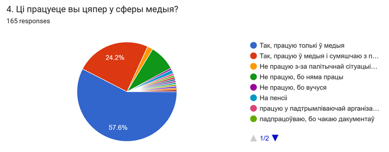 Так, працую толькі ў медыя – 57,6%. Так, працую ў медыя і сумяшчаю з працай у іншай сферы – 24,2%. Не працую, бо няма працы – 8,5%. Не працую праз палітычную сітуацыю ў Беларусі – 1,8%. На пенсіі – 1,2 %. Іншыя адказы – па 0,6%.