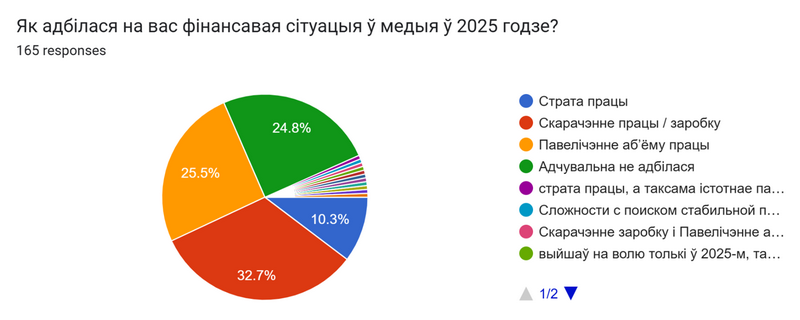 Як адбілася на вас фінансавая сітуацыя ў медыя ў 2025 годзе? Скарачэнне працы / заробку – 32,7%. Страта працы – 10,3%. Павелічэнне аб’ёму працы з прычыны кадравых скарачэнняў – 25,5%. Адчувальна не адбілася – 24,8%.
