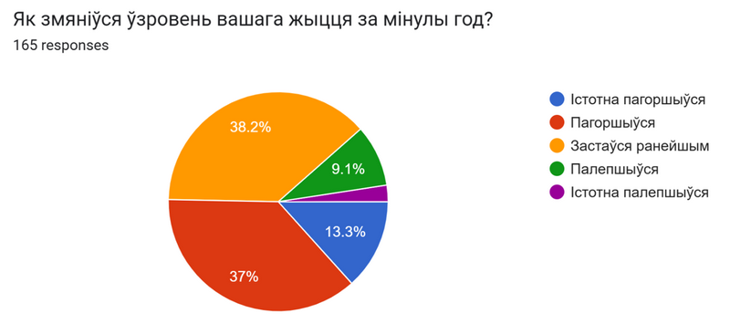 Як змяніўся ўзровень вашага жыцця за мінулы год? Істотна пагоршыўся – 13,3%. Пагоршыўся – 37%. Застаўся ранейшым – 38,2%. Палепшыўся – 9%. Істотна палепшыўся – 2,4%.