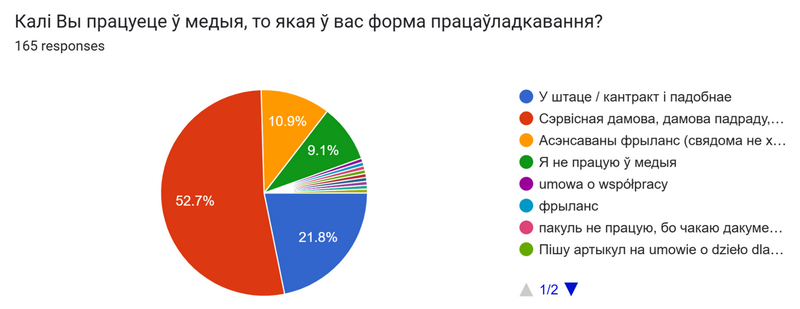 Калі Вы працуеце ў медыя, то якая ў вас форма працаўладкавання? Сэрвісная дамова, дамова падраду, umowa zlecenie, umowa o dzieło і падобнае – 52,7%. У штаце / кантракт і падобнае – 21,8 %. Асэнсаваны фрыланс (свядома не хачу прывязвацца да адной рэдакцыі) – 11% Больш за палову апытаных працуюць на сервісных дамовах, а не ў штаце медыя.