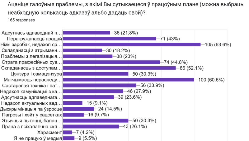 Адсутнасць адпаведнай працы – 21,8%. Перагружанасць працай – 43 %. Нізкі заробак, недахоп сродкаў у вашым медыя, непрадказальнасць фінансавання – 63,6%. Складанасці з атрыманнем аплаты (юрыдычныя і банкаўскія абмежаванні) – 18,2%. Праблемы з легалізацыяй, якія ўплываюць на працаўладкаванне – 23%. Страта прафесійных сувязяў унутры Беларусі – 44,8%. Складанасць з доступам да інфармацыі, адсутнасць крыніц, закрытасць – 52,1%. Цэнзура і самацэнзура – 30%. Магчымасць пераследу мяне альбо маіх родных за маю прафесійную дзейнасць – 60,6%. Састарэлая тэхніка і патрэба ў яе замене – 33,9%. Недахоп камунікацыі з калегамі – 27,9%. Адсутнасць адпаведнага памяшкання для працы – 23,6%. Недахоп актуальных ведаў, навыкаў, патрэбных для працы – 9,1%. Дыскрымінацыя па ўзросце – 14,5%. Пагрозы і хэйт у сацсетках – 9,7%. Этычныя пытанні, баланс паміж бяспекай крыніц і паўнатой інфармацыі – 30,3%. Праца з псіхалагічна складанымі тэмамі – 26,1%. Харасмент – 4,2%
