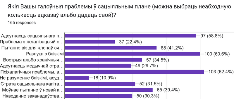 Адсутнасць сацыяльнага пакета, немагчымасць працаваць у штаце – 58,8%. Праблема з легалізацыяй сябе альбо членаў сям’і ў новай – 22,4%. Пытанне віз для членаў сям’і, якія засталіся ў Беларусі – 41,2%. Разлука з блізкімі – 60,6%. Вострыя альбо хранічныя праблемы са здароўем – 34,5%. Адсутнасць медычнай страхоўкі – 29,7%. Псіхалагічныя праблемы, выгаранне, стрэс – 62,6%. Неразуменне блізкімі, асуджэнне – 10,9%. Страта сацыяльнага капіталу, адсутнасць сяброў – 31,5%. Моўнае пытанне ў новай краіне – 39,4%. Няведанне заканадаўства новай краіны, няведанне сваіх правоў і магчымасцяў – 30,5%