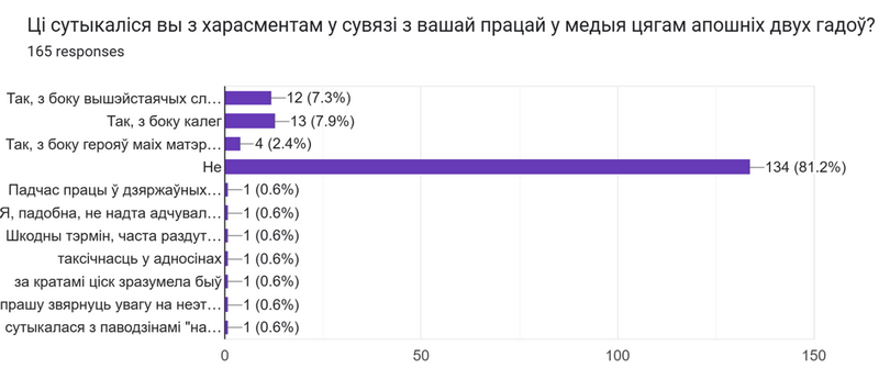 Агулам 15,7% апытаных (26 рэспандэнтаў) заявілі, што сутыкаліся з харасментам у сувязі з іх працай у медыя цягам апошніх двух гадоў. Фармулёўка пытання была ідэнтычнай да фармулёўкі 2024-года з мэтай параўнання. Пытанне гучала наступным чынам:
