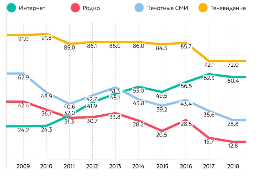Как отмечается в докладе, главным источником информации для жителей Беларуси остается телевидение. Однако его доля в структуре медиапотребления снижается. Все большее влияние имеет интернет. Причем он уже стал лидирующим каналом на рекламном рынке, обогнав в 2019 году по доле телевидение.