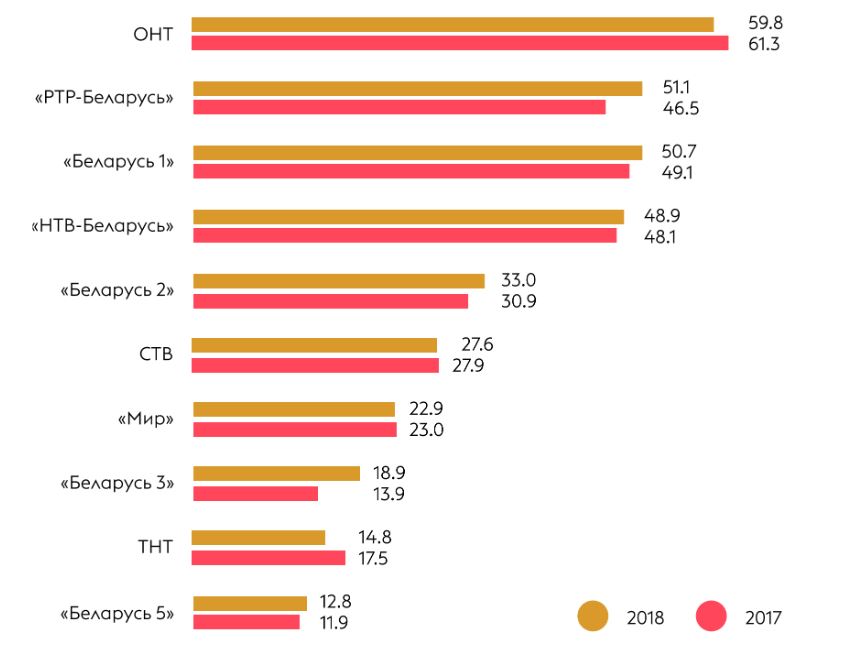 Самые популярные телеканалы среди белорусских зрителей (смотрели в течение месяца перед опросом, в % от числа опрошенных).