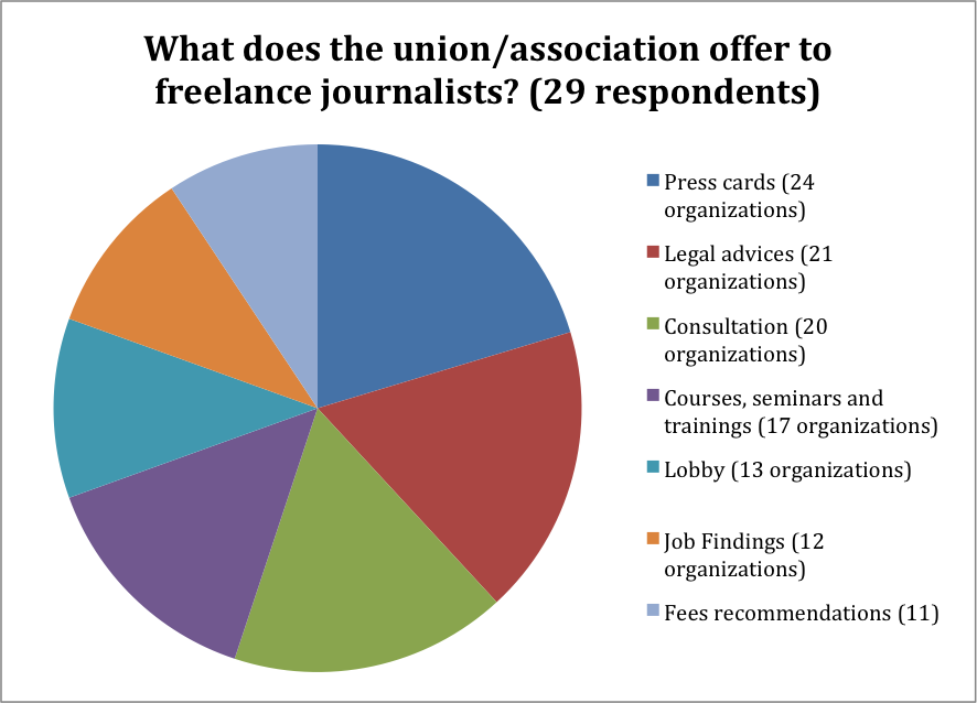 У апытанні датычна абароненасці журналістаў-фрылансераў удзельнічалі прадстаўнікі 33 арганізацый з 28 краін. Даследаванне выявіла арганізацыі з вельмі высокім адсоткам фрылансераў (да 70% у нямецкай DJV і Польскай асацыяцыі журналістаў). Але ёсць асацыяцыі, дзе фрылансераў 0% (TGS, Турцыя, ESIEMTH, Грэцыя).