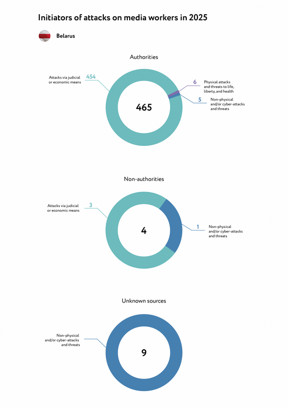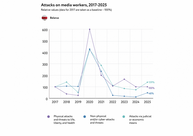 У 2025 годзе было выяўлена і прааналізавана 478 выпадкаў нападаў/пагроз у дачыненні да працаўнікоў медыя, а таксама рэдакцый традыцыйных і анлайн-медыя ў Беларусі і беларускіх журналістаў у выгнанні, гаворыцца ў дакладзе.