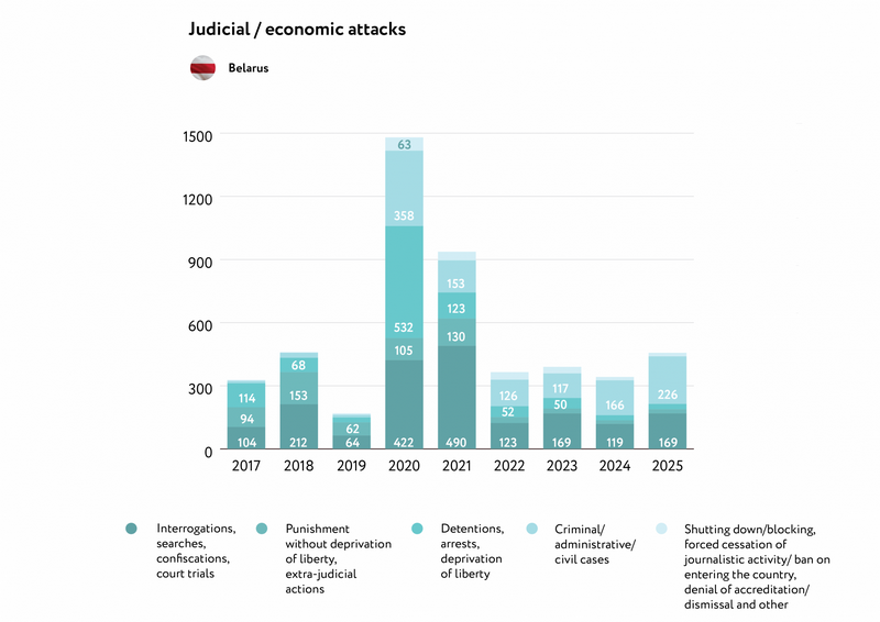 Напады праз судовыя і/ці эканамічныя механізмы застаюцца галоўным спосабам ціску на журналістаў — яны складаюць 95% усіх зафіксаваных інцыдэнтаў.