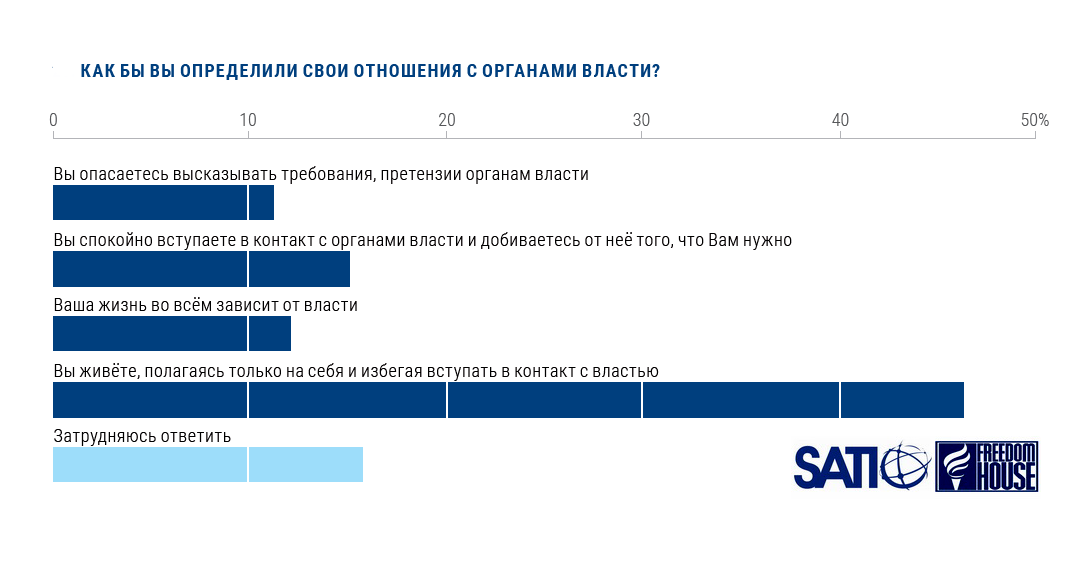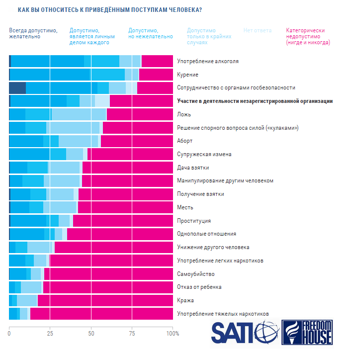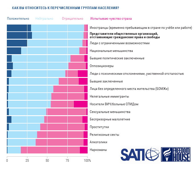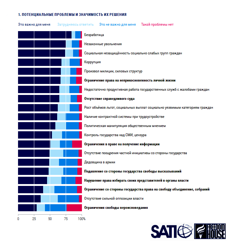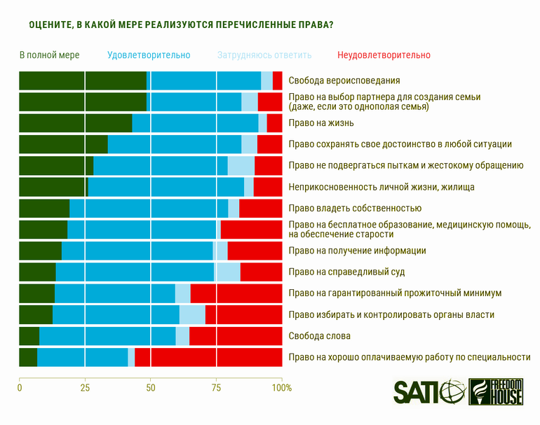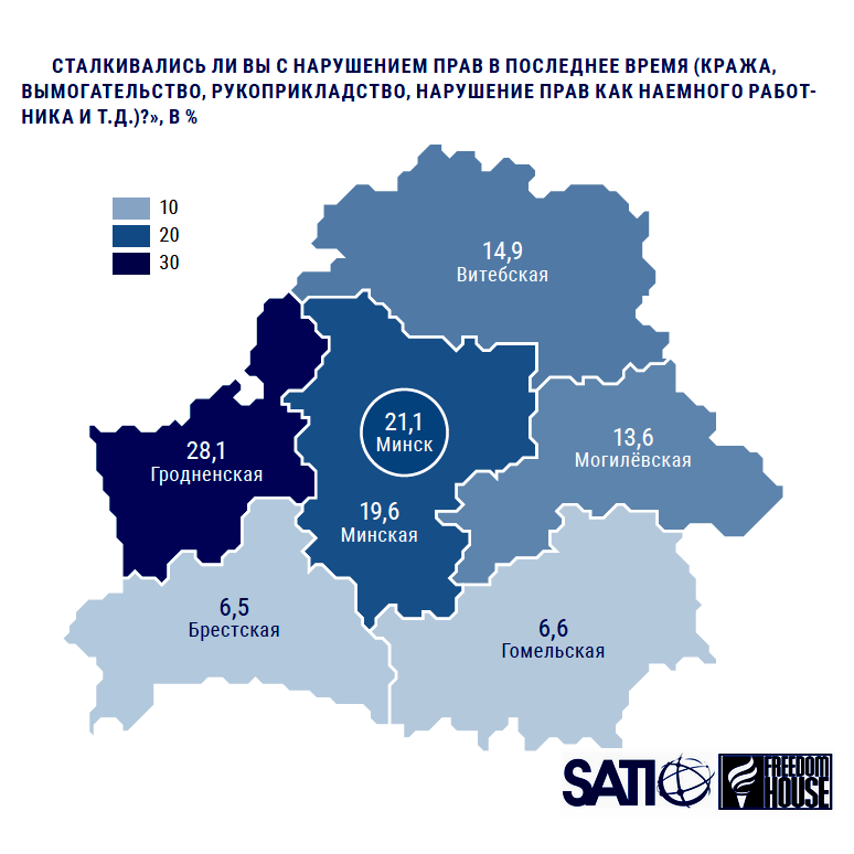 Нядаўна ў шырокім доступе з’явілася сацыялагічнае даследаванне “Асаблівасці беларускай правасвядомасці. Успрыманне і стаўленне да правоў чалавека”. Даследаванне было праведзена па замове Freedom House групай кампаній Satio у 2016-м годзе. Удзел у ім прынялі 1000 чалавек з гарадоў Беларусі насельніцтвам ад 50.000 чалавек.