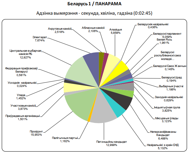 Тэме выбараў яна прысвяціла крыху больш за 3 % часу. І прыкладна 14 % — спорту і прагнозу надвор’я (звярну ўвагу чытача, што на графіках візуалізаваныя і добра чытаюцца гэтыя ды іншыя лічбы, а таксама бачна як рэпрезентаваныя суб’екты выбарчага працэсу).