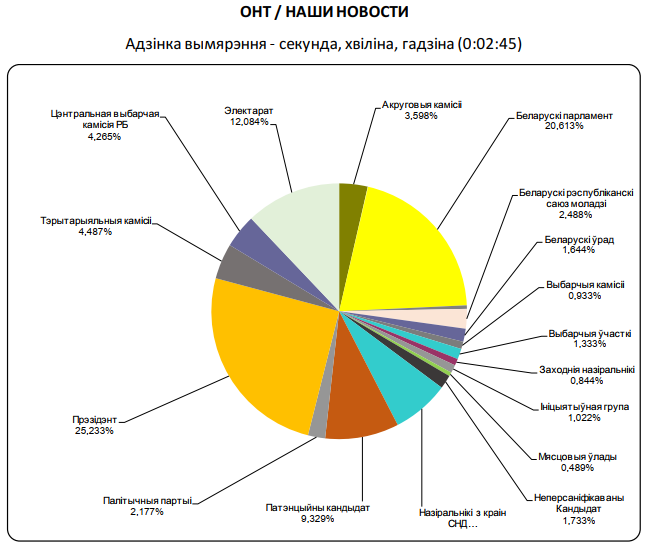 Другая агульнанацыянальная навінавая праграма “Наши новости” (ОНТ) адвяла Прэзідэнту крыху больш за 25 % часу параўнальна з астатнімі суб’ектамі выбарчага працэсу.