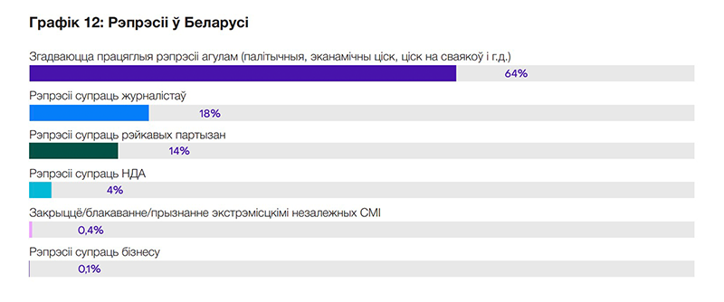 Але ж, як канстатуюць эксперты Цэнтра новых ідэй, палітычныя рэпрэсіі ўсё ж згадваюцца — звычайна як працяглы феномен. Замежныя СМІ пісалі пра дзеянні супраць журналістаў, а таксама пра затрыманні і прысуды рэйкавым партызанам. Аднак амаль няма звестак пра рэпрэсіі супраць бізнес-сектара.