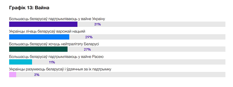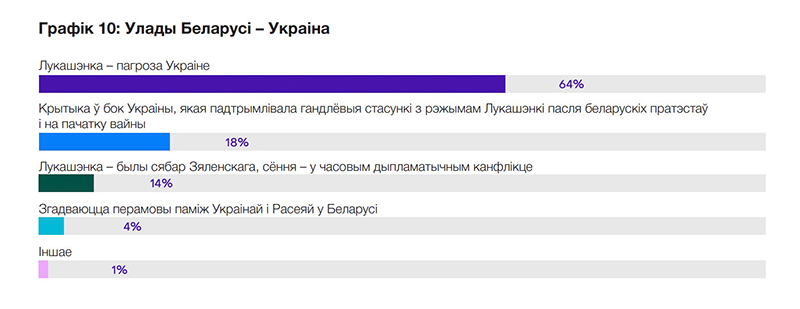 Да таго ж на 11% павялічылася доля матэрыялаў, якія адзначаюць, што ўкраінцы лічаць беларусаў варожай нацыяй. Часцей за ўсё гэтае меркаванне выказвалася ў польскіх і ўкраінскіх выданнях. Цікава, што ва ўкраінскіх СМІ ў параўнанні з мінулым годам больш заўважная ідэя аб тым, што ўкраінцы ўдзячныя за падтрымку тых беларусаў, якія дапамагаюць іх краіне.