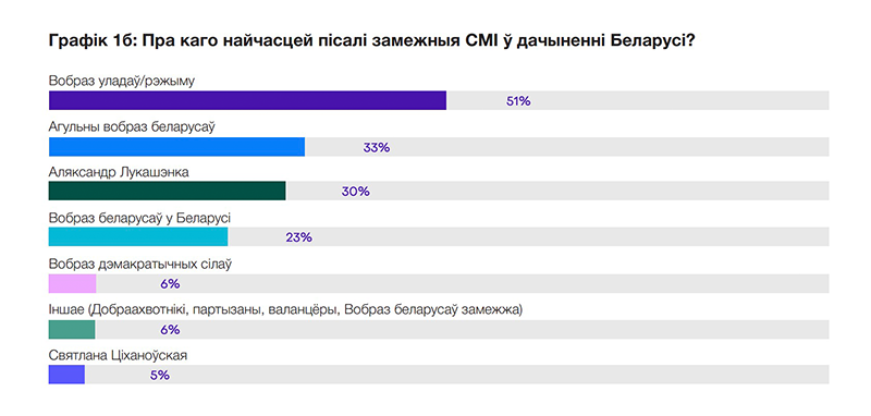 — У 2022–2023 гадах Беларусь прываблівала ўвагу міжнародных СМІ праз уцягнутасць рэжыму ў ваенныя дзеі на тэрыторыі Украіны, унутрыпалітычны крызіс і міжнародную актыўнасць дэмакратычных сілаў. У цэнтры ўвагі за прааналізаваны перыяд апынуліся такія падзеі, як мяцеж Прыгожына і роля Лукашэнкі ў далейшым яго развіцці, сустрэчы Пуціна і Лукашэнкі, размяшчэнне ядзернай зброі ў Беларусі, міжнародныя візіты Святланы Ціханоўскай, — адзначаецца ў даследаванні.