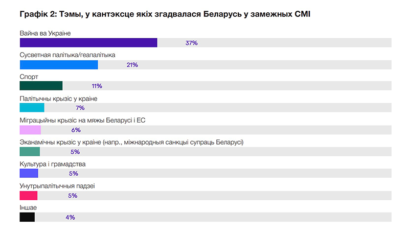Большасць публікацый, якія даследаваліся падчас маніторынгу, асвятлялі падзеі ў Беларусі праз прызму вайны ва Украіне, а таксама праз геапалітыку. Акрамя таго, наша краіна згадвалася ў фокусе спартыўных падзеяў, напрыклад падчас абмеркавання ўдзелу спартоўцаў у Алімпіядзе-2024. Палітычны крызіс у краіне і ўнутрыпалітычныя падзеі цікавілі замежных журналістаў нашмат радзей.