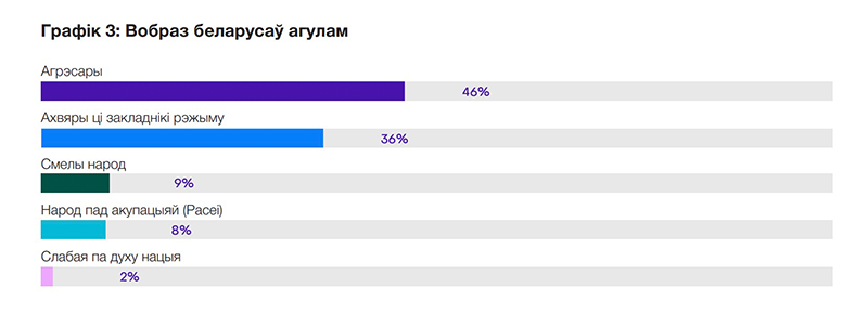 У 46% прааналізаваных выпадках беларусаў называюць агрэсарамі. Найбольш гэта характэрна для польскіх і ўкраінскіх выданняў, найменш — для брытанскіх. Аднак, калі гаворка ідзе пра беларусаў унутры краіны, часцей за ўсё выкарыстоўваецца вобраз ахвяраў рэжыму.