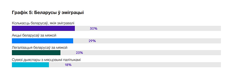 Прыкладна тое ж самае назіраецца ў другіх краінах. Беларусы замежжа сталі героямі 3% прааналізаваных артыкулаў. Найчасцей дыяспара згадвалася ў кантэксце палітычных акцый за мяжой і пытанняў легалізацыі беларусаў. Актыўнасці часцей за ўсё цікавілі журналістаў амерыканскіх выданняў, а пытанні легалізацыі больш фігуравалі ва ўкраінскіх і польскіх СМІ.