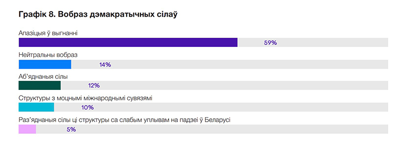 Дэмакратычныя сілы агулам згадваліся ў 6% прааналізаваных матэрыялаў. У большасці з іх захоўваецца вобраз «апазіцыі ў выгнанні з моцнымі міжнароднымі сувязямі». Выбіваецца вобраз беларускіх дэмакратычных сілаў толькі ва ўкраінскіх медыях, якія часцяком апісваюць іх як раз’яднаныя структуры са слабым уплывам на сітуацыю ў Беларусі. Найбольш пазітыўны вобраз дэмакратычных сілаў адлюстраваны ў польскіх артыкулах, якія ў пяць разоў больш за іншыя матэрыялы характарызуюць дэмакратычныя сілы як моцныя і аб’яднаныя.