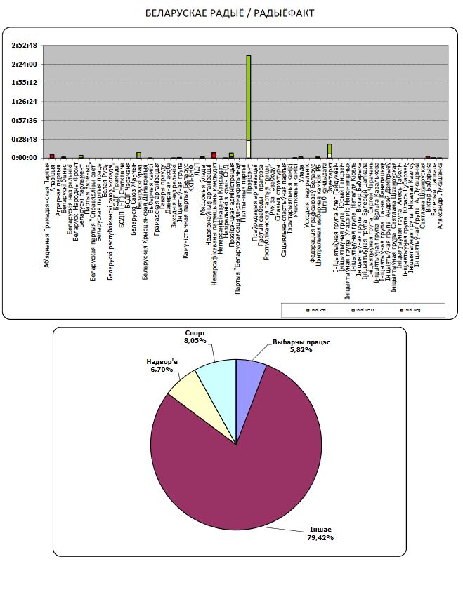 Час, адведзены ў праграме “Радыёфакт” (Першы нацыянальны канал Беларускага радыё) выбарам (6 %), быў таксама меншы за адведзены надвор’ю (7 %) і спорту (8 %).