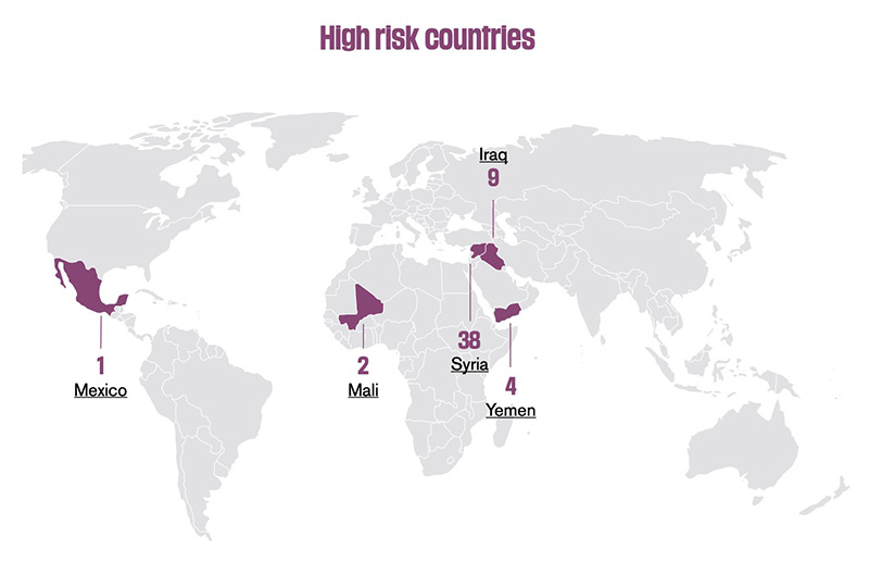 На дадзены момант у закладніках знаходзяцца 54 прадстаўнікі медыяў. Найбольш небяспечныя з гэтага пункту гледжання краіны — Сірыя, Ірак, Йемен, Мексіка і Малі.