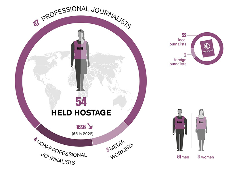 Хаця зарэгістраваная колькасць журналістаў, узятых у закладнікі ў мінулым годзе, з’яўляецца самай нізкай з 2017-га, «Рэпарцёры без межаў» лічаць сітуацыю трывожнай. З сямі журналістаў, выкрадзеных у 2023 годзе (Мексіка, Гаіці, Йемен, Малі), двое дагэтуль знаходзяцца ў палоне.