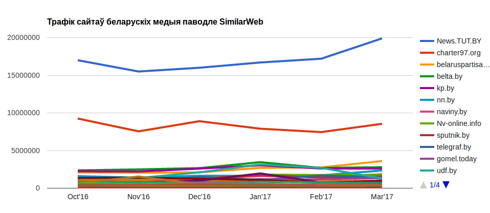 На новым графіку мы бачым важкі ўсплёск трафіку ў студзені 2017 года (belta.by, udf.by, kp.by і інш.), потым вяртанне да лістападаўскіх паказчыкаў у лютым і заўважны рост трафіку ў сакавіку. Праўда тут на першыя пазіцыі выходзяць іншыя выданні (belaruspartisan.org, nn.by і naviny.by), але і раней згаданыя выданні захоўваюць свае высокія пазіцыі па наведвальнасці сайтаў, або паказваюць невялікі рост.