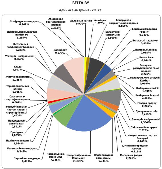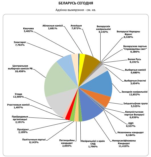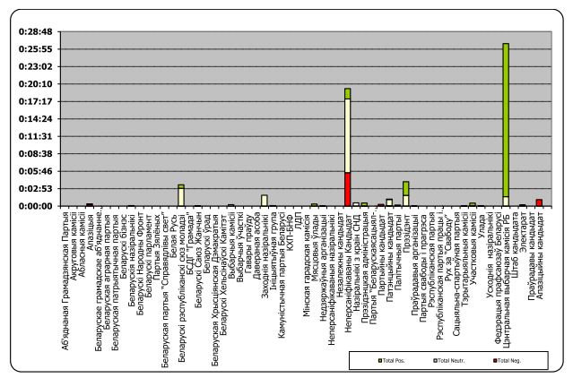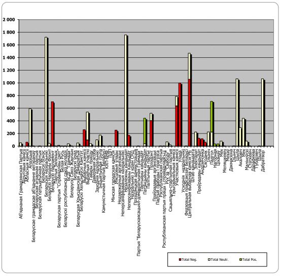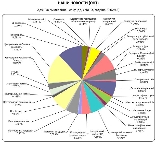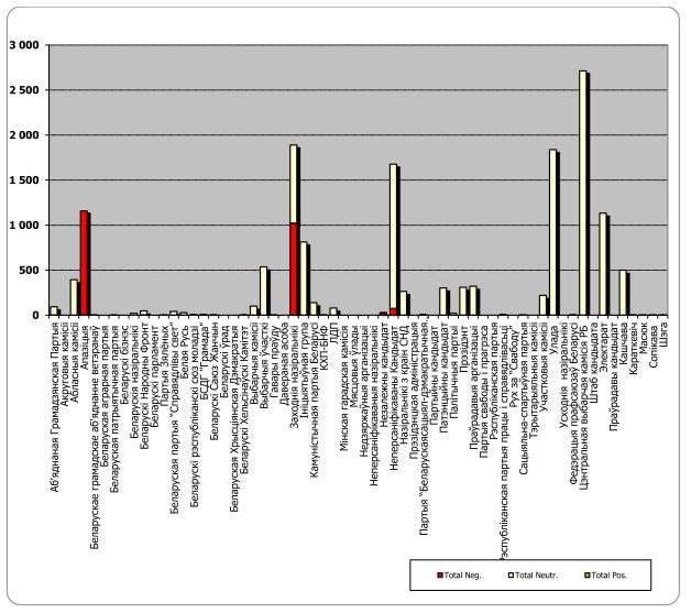 Што да медыйнай прысутнасці палітычных партый, дык яна была не проста меншай, а мізэрнай, калі пра іх увогуле штосьці казалі. Напрыклад, праграмы “Наши новости” ОНТ, “Панарама” (“Беларусь 1”), “Главный эфир” (“Беларусь 1”) нічога не казалі пра канкрэтныя палітычныя партыі. А ў тых выпадках, калі пра іх штосьці казалася, доля часу і плошчы была меншай за 0,5% (напрыклад, гл. Графікі інфармацыйнага парталу belta.by ці праграмы “Радыёфакт”).