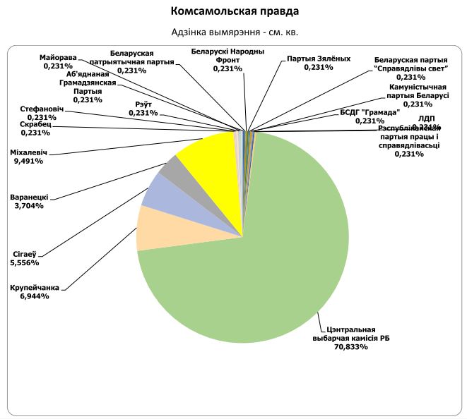 “Комсомольская правда в Белоруссии” (“Таўстушка”) пэўны перыяд маніторынгу ўвогуле не друкавала ніякіх матэрыялаў, прысвечаных тэме выбараў. А калі пазней пачала пісаць пра некаторых кандыдатаў, то плошча, адведзеная ім, была мізэрная. Палітычныя партыі ўзгадваліся адно мімаходзь.
