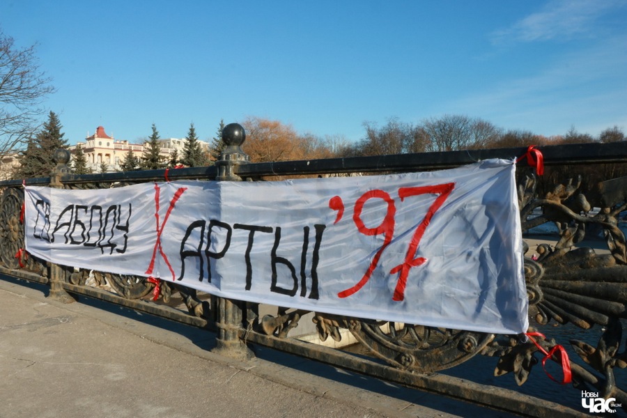 Удзельнікі акцыі разгарнулі на мосце праз Свіслач ля парку Горкага транспарант з патрабаваннем свабоднага доступу да апазіцыйнага сайта, запалілі чырвоныя і зялёныя фаеры, а таксама каля хвіліны скандавалі лозунгі “Свабоду слова на Беларусі!”, “Свабоду Хартыі-97!”, “Лукашэнка — вораг інтэрнэту!”.