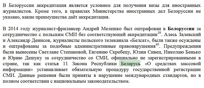 “У некаторых краінах – удзельніцах АБСЕ акрэдытацыя часта ўспрымаецца як дазвол на працу, што не адпавядае міжнародным стандартам у галіне свабоды выказвання меркаванняў”, – адзначаюць аўтары дакумента.