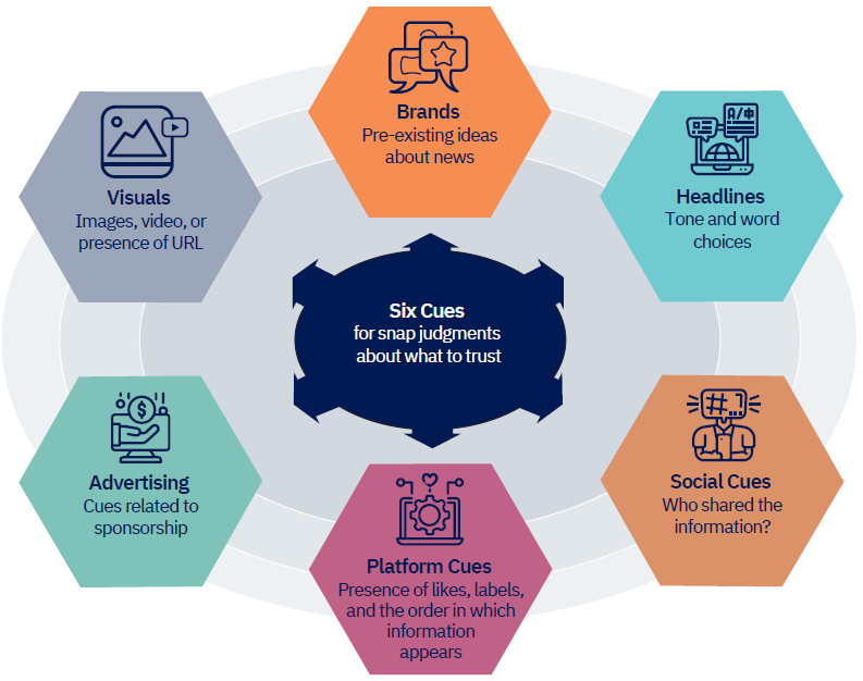 Сталкиваясь с новостями в Facebook, Google или WhatsApp, участники опроса быстро выносили суждения относительно достоверности этой информации. Эти суждения, как правило, основывались на шести основных факторах — вы можете видеть на этой схеме: