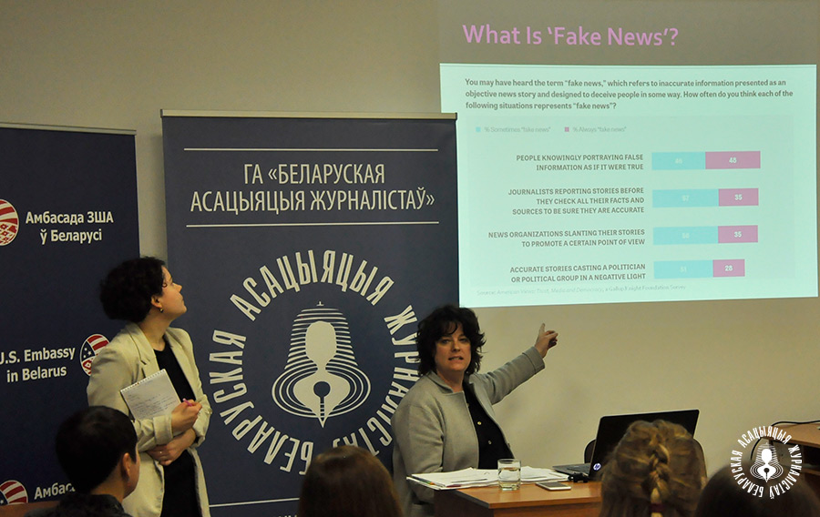 Словазлучэнне fake news (фальшывыя навіны, фэйкі) настолькі часта згадвалася ў 2017 годзе, што слоўнік англійскай мовы Collins прызнаў яго словам года. "Ілжывая, часта сенсацыйная інфармацыя, якая распаўсюджваецца пад выглядам навінавых паведамленняў" (вызначэнне ў слоўніку — рэд.) трапляе ў стужкі навін нават аўтарытэтных выданняў. Што ж такое фэйкавыя навіны ў сучасным рытме жыцця? Пра гэта разважалі падчас сутрэчы ў офісе ГА “БАЖ” з віцэ-прэзідэнтам Музея журналістыкі і навін у Вашынгтоне Барбарай МакКормак.