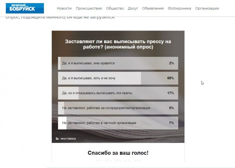 Напрыканцы лістапада «Вечерний Бобруйск» запусціў апытанку, ці прымушаюць выпісваць газеты або часопісы на працы. Згодна яе вынікам з 1513 чалавек 69% прымушаюць падпісвацца на газеты, хоць яны гэтага і не хочуць.
