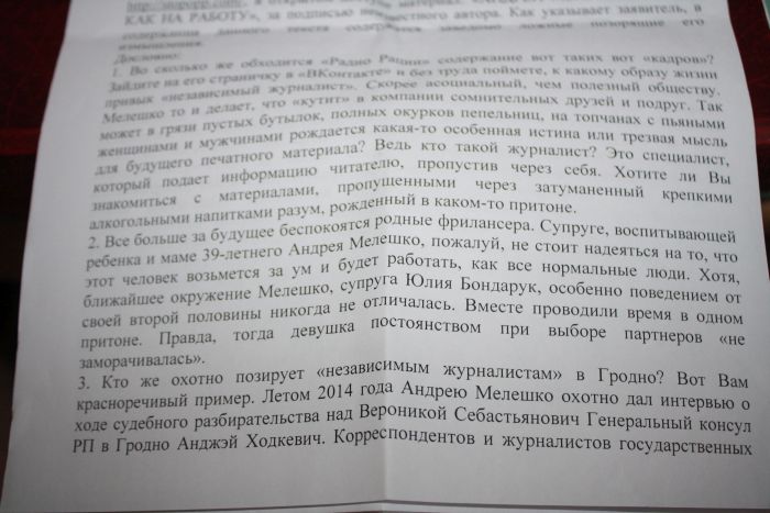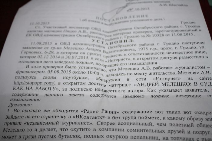 Яшчэ ў пачатку жніўня 2015 году Андрэй Мялешка звярнуўся ў міліцыю з заявай, у якой прасіў пакараць аўтараў артыкулу на адным з расійскіх сайтаў. Публікацыя тычылася гродзенскага журналіста, яго калегаў і сям’і. Журналіст лічыць публікацыю паклёпніцкай і прасіў міліцыю завесці справу па арт. 188 КК РБ («Паклёп»).