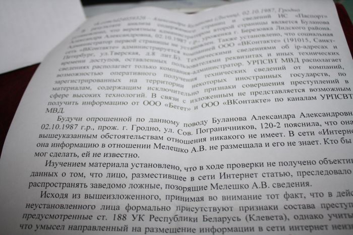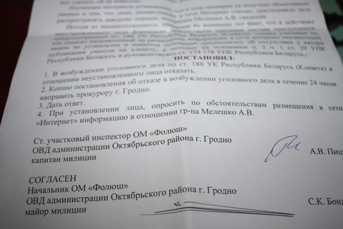 Андрэй Мялешка: міліцыянты не жадаюць караць паклёпнікаў (+копія дакумента)